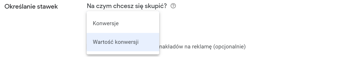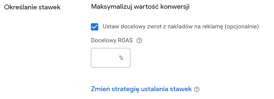- maksymalizacja wartości konwersji, w której możesz dodać wartość ROAS.