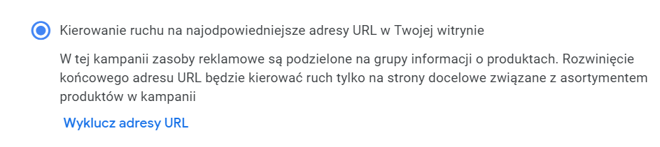 W ustawieniach kampanii wybierz opcję „Kierowanie ruchu na najodpowiedniejsze adresy URL w Twojej witrynie”. Nie zapomnij również wykluczyć adresów URL, które nie są dla Ciebie ważne z punktu prowadzenia kampanii, a kierowanie na nie użytkowników nie przyczyni się do wzrostu liczby konwersji. Przykładami takich stron są m.in.: Regulamin, Polityka Prywatności czy Dostawa.