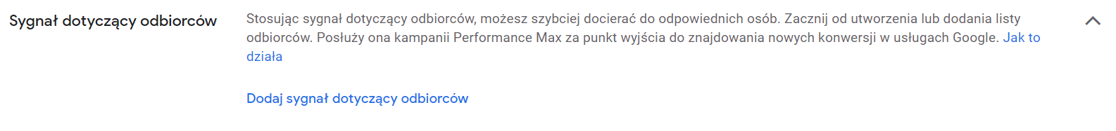 W kampanii Performance Max nie możesz określić grupy odbiorców, do której chciałbyś kierować reklamy. Możesz natomiast ustalić sygnały odbiorców, które mogą być wskazówką dla systemów uczących Google, do jakich odbiorców powinny one docierać. W sygnałach wykorzystaj listy remarketingowe, np. listę odbiorców, którzy zrealizowali konwersje. Możesz również wykorzystać grupę odbiorców dopasowanych na podstawie zainteresowań i danych demograficznych.