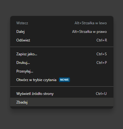 - W ekranie przeglądarki, zanim przejdziemy do witryny, klikamy prawym przyciskiem myszki i wybieramy opcję „Zbadaj”