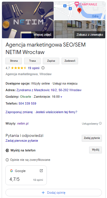 Opinie wystawione Twojej firmie pojawiają się przede wszystkim w profilu firmy. To właśnie stamtąd Google może je zebrać, a następnie wyświetlić w lokalnych wynikach wyszukiwania, w mapach Google, a także w panelu wiedzy.