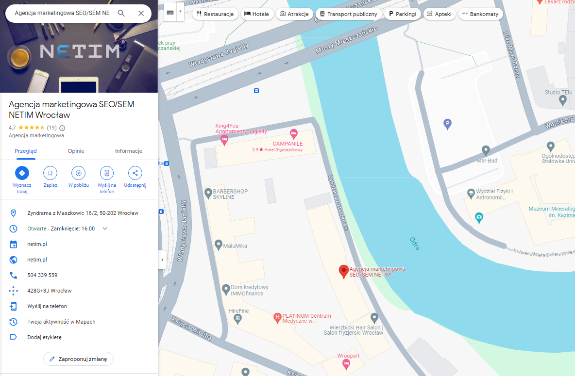 Ostatnim miejscem, w którym wyświetlane są opinie, są Google Maps – Mapy Google. Jeśli ktoś natrafi na Twoją firmę, przeglądając mapę, będzie w stanie znaleźć wszelkie informacje o prowadzonej przez Ciebie działalności – a w tym także recenzje.