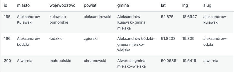 W przypadku lokalnych usług sytuacja jest jednak dużo prostsza. Wystarczy lista miejscowości w Polsce. Takie dane są publicznie dostępne i można je znaleźć w wielu otwartych zbiorach danych.