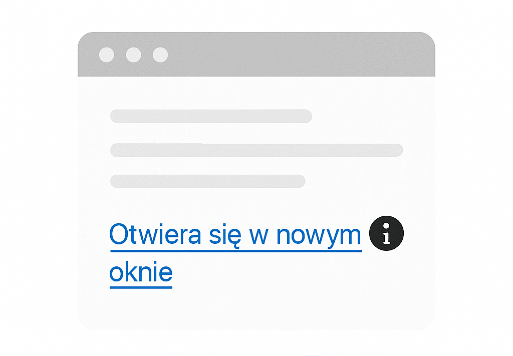 Jeśli kliknięcie linku powoduje otwarcie nowej zakładki, użytkownik powinien być o tym poinformowany – np. poprzez tekst „otwiera się w nowym oknie” lub atrybut title. To szczególnie ważne dla osób korzystających z czytników ekranu.